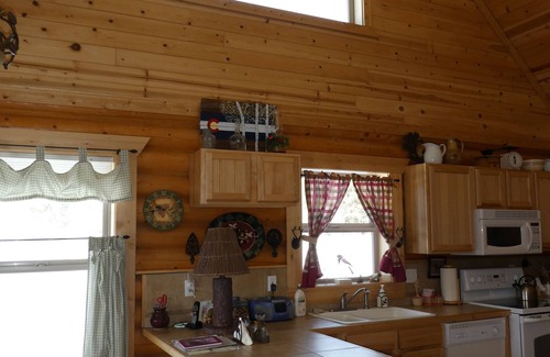 The cabin has 2 bedrooms - one rather large loft concept upstairs and one downstairs both with baths. Main floor has the kitchen/dining and living area with plenty of natural light. Lovely front porch which allows one to sit on and admire the scenery or eat outside on a large wooden picnic table.