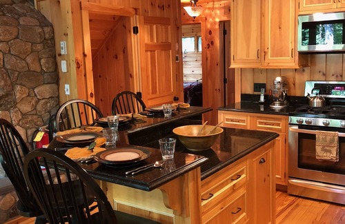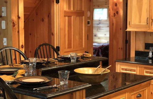 Upstairs there is a cozy loft with a loveseat (that pulls out to twin size bed) and classic Adirondack lounging chair with a leather ottoman. This area has a flat screen TV and bookcase with a variety of DVD's, books and trail guides. This is the perfect place to curl up with a book, watch your favorite movie or plan your next hike. This level also includes the Master Bedroom. The Master bedroom has a king sized log bed. Adjacent to this room is a small bedroom with bunk beds. It has a window that overlooks the stream and woods. The Master bathroom is located directly off the master bedroom and includes a single bowl vanity with a granite countertop, tub/shower enclosure and a separate toilet area.