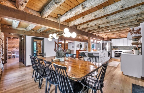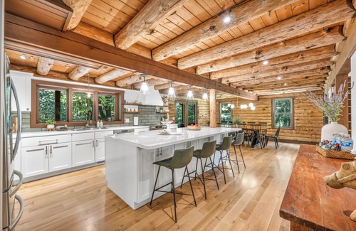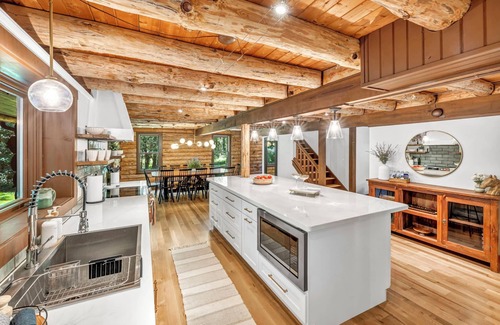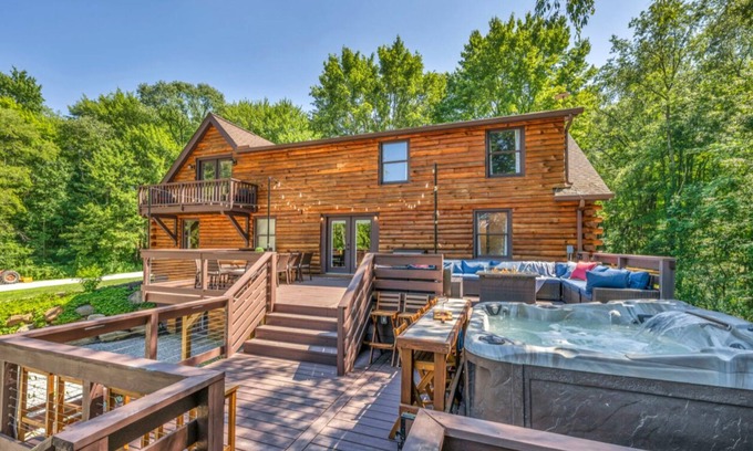 - 3-level 3,500 sq ft renovated log cabin with private ¼-acre swimming pond, huge deck with hot tub, theatre room, perfect for family gatherings and group retreats.