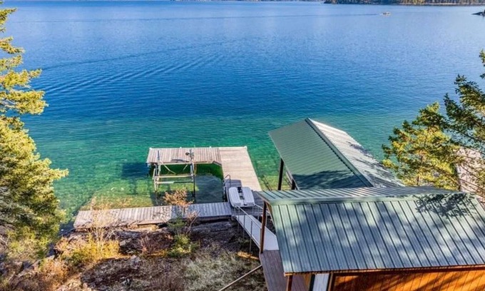 Custom built Montana log home with views of the Mission Mountains and Flathead Lake. This large house is located on Safety Bay, four-bedroom, 2.5-bathrooms. Vaulted ceilings, large trex deck, covered boathouse. Sleeps 10 people between beds and sofa sleepers! Stairway to lake is aluminum and is secured to rocks by rebar that is drilled into the rock and goes up into the posts of stairway. There's a boat house half way between main house and lake with an extra single bed only no bathroom, great for a teenager. Must have 4 wheel drive.
