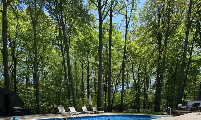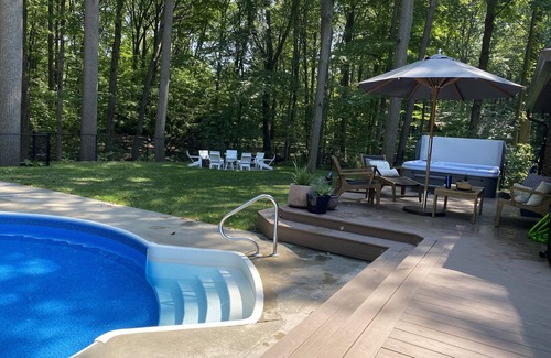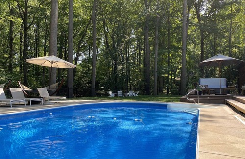 Heated in-ground pool with salt water system (open May 15- Oct 1 ), 8-person hot tub (open year-round). Enjoy the fire pit beneath towering 120' poplar trees. Unlimited firewood provided. All soaps, paper products, and kitchen essentials (such as salt and pepper) are stocked for use.