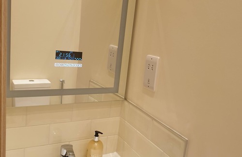 Bathroom: power shower, toiletries, shaving plug, hairdryer, Bluetooth mirror.