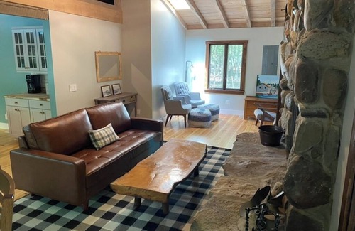 The cabin offers 3 bedrooms - all with a view into the surrounding woods. The large bathroom has a tiled tub & shower, and also offers a washer and dryer. Cooking is easy in the galley-style kitchen and there is room for the whole family around the large butcher-block island. At the end of the day - settle in by the fireplace or maybe play cards around the dining table. The living space is very spacious with lots of cozy seating options.