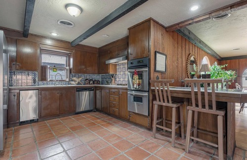 Throughout both buildings, you'll discover authentic Texas charm with modern comforts. Beautiful wood-paneled walls, exposed ceiling beams, and terracotta tile floors create a warm, inviting atmosphere. Multiple living spaces provide plenty of room for your group to gather or find quiet corners for relaxation.