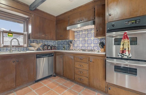 The heart of the main house features a cozy living room centered around a brick fireplace with comfortable seating and southwestern-inspired décor. The kitchen combines functionality with character, offering stainless steel appliances alongside decorative blue tile accents and ample counter space for preparing meals together.