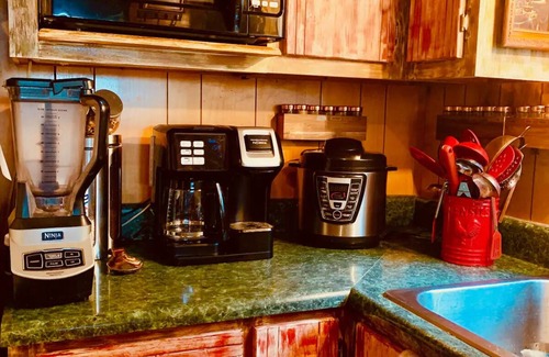 Recently remodeled modern cabin, nestled in the woods, with many upgrades such as 2 flat-screens, washer & dryer leather recliners, top of the line Posturepedic bed with adjustable remote control, fully equipped kitchen with lovely original art and antiques, etc....