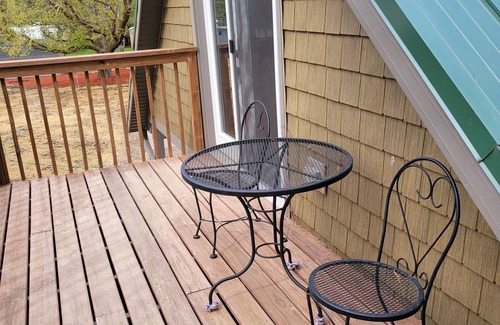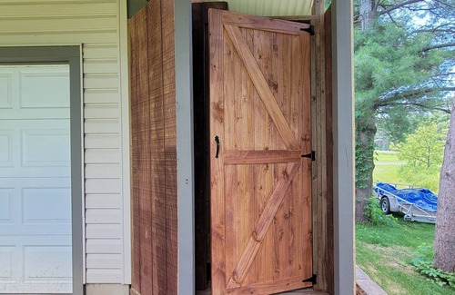 Come stay at the lake and upgrade your camping experience. The birds eye view of the lake is wonderful! The French door opens up to a private deck that is great for your morning coffee or evening meal. The bedroom has 4 single beds. This space can be reserved with the main house. The kitchen has a fridge and microwave and table for 4. There is a half bath but NO indoor shower. There is a private outdoor shower. Be aware that there are stairs to access the unit. we have a security camera on the front and back of the garage facing the front and back yard, they will be on and are only outside. The outdoor spaces are shared with the main house guests and owners(except your deck space, that is yours to enjoy) we do have a large dog when we are on site.