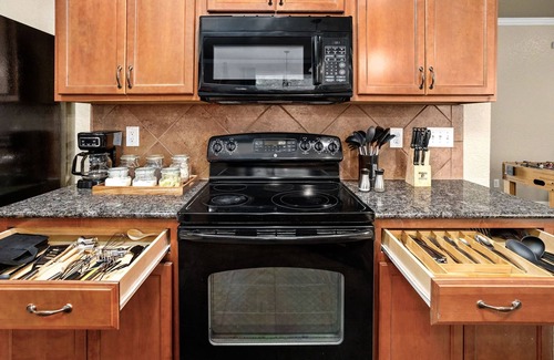 • Fully stocked kitchen w/ microwave, dishwasher, stove, oven