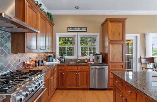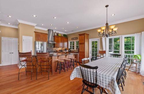 Dining table that seats 10 comfortably and overlooks the lake, providing a spectacular view of the lake while dining together, and the homeowner is a gourmet so there is a fully equipped kitchen including serving pieces. There is also a Keurig coffee maker (bring your own pods) as well as a regular coffee maker.