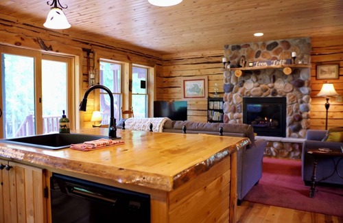This beautiful custom-built log home has 1000 square feet of living space with 1 bedroom and 1.5 baths, with sleeping for 6 plus 2 small cots (great for kids!). The main floor living room has a beautiful gas fireplace, a kitchen and a full bath with natural stone shower. The main bedroom and half bath are upstairs.