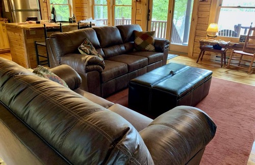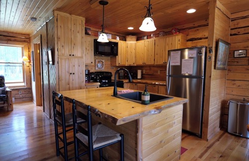 This beautiful custom-built log home has 1000 square feet of living space with 1 bedroom and 1.5 baths, with sleeping for 6 plus 2 small cots (great for kids!). The main floor living room has a beautiful gas fireplace, a kitchen and a full bath with natural stone shower. The main bedroom and half bath are upstairs.