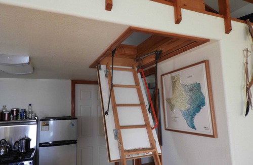 The kitchen is small but fully equipped and stocked for meal preparation. The living room is comfortably sized and cozy with a leather sofa and chair and views of the Chisos Mountains. The bedroom has a new queen-sized bed and quality linens. The sleeping loft is not recommended for adults or anyone with limited mobility due to the low ceiling and the pull-down ladder. It has two new twin-sized beds and overlooks the living room.