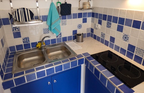 The house has a room with a kitchenette (induction), a sofa bed (2 places), a wardrobe, flat-screen TV, private bathroom with shower, heat pump (cold and hot air), outdoor shower with water hot. You can have lunch in the outdoor patio furnished with a table and a sofa in a garden shared with another home.