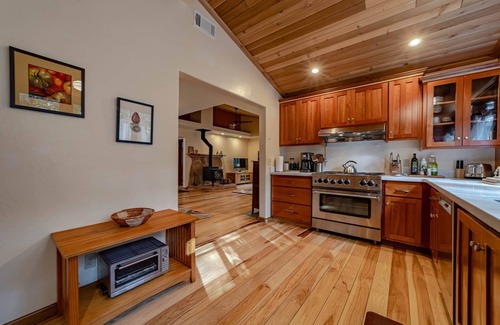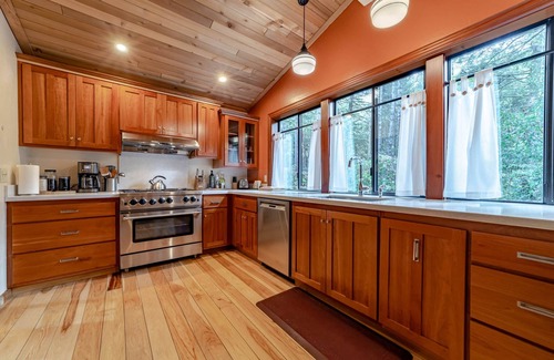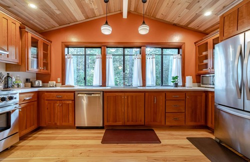 The 2,000-square foot house has a large kitchen with a full-size gas range, and is supplied with a complete set of pots, pans, cookware, dishes, spices, and a well-stocked pantry with some supplies you may need, such as sugar, flour, cooking oil, canned goods, noodles and rice. In addition we have a slow cooker, toaster oven, microwave, electric mixer, baking dishes, and storage containers for your leftovers. We offer everything you need for morning coffee, including whole roasted coffee beans, a grinder, electric drip pour-over cone, or French press. The Bosch dishwasher helps make clean up easier.