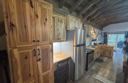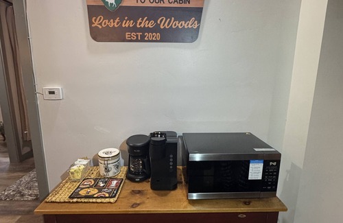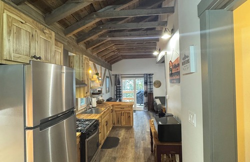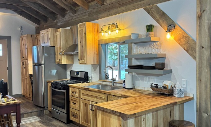 Step inside, and you’ll feel right at home. Our cabin features a comfortable bedroom with a queen bed and a welcoming living room with a sleeper sofa, perfect for two children or a pair who don’t mind snuggling up. With Wi-Fi available, you can stay connected while enjoying the beauty of the woods. The full kitchen includes all the essentials—coffee maker, microwave, and more—so you can enjoy your favorite meals (though there's no dishwasher, just like grandma's cabin!). The full bath features on-demand hot water, while the in-unit washer and dryer add a touch of homey convenience.