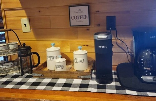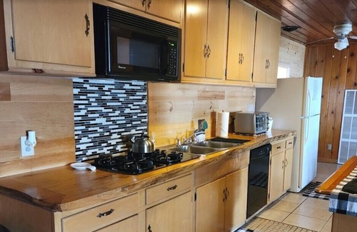 Lost Lake Getaway comes with a fully-equipped kitchen (NO STOVE, ONLY COOK TOP), dining area, living room, one and a half baths and four bedrooms. This log home is ideal for an active getaway.