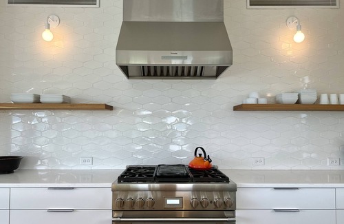 Chef's kitchen with Thermador appliances, 36" gas range, speed oven/microwave, beverage refrigerator, and fully stocked cooking/baking equipment. Ninja drip coffee maker with stocked coffee beans and grinder. Nespresso requiring original pods for espresso. Large kitchen island for cooking, baking, eating with 7 stools. Dining table can seat 10 guests. Entry area has mudroom, laundry closet, coat closet, and full bathroom with shower including hand held spray to wash dirty feet/paws. Covered porch with table and soft sofa seating. Patio has large Weber gas grill and Solo Stove Yukon fire pit with Adirondack chairs, and Hot Springs saltwater spa.