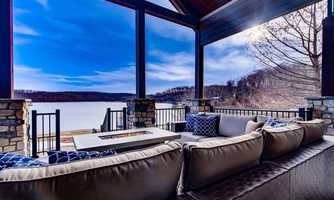 This 6 bedroom, 5 bathroom house sits on the banks of a quiet point with breathtaking views of the lake. Making this the ideal location for either a family gathering, relaxation, or wedding event.This house is overlooks a quiet cove with views of the lake and other lake homes. You will feel incredible secluded as you are sitting on the back patio.