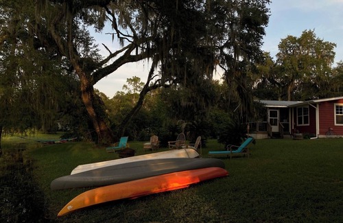 Escape to the lakeside and unwind in the natural beauty that awaits you at your two bedroom/two bath spacious cottage nestled in seclusion on four rustic acres. Three rocking chairs wait patiently for you to take in the beauty and calmness of Lake Consuela. Lay by the lake and listen to the sounds of the Florida country in a Chaise lounge or cozy up to a firepit with a lakeside view. Take the rowboat on the lake for a chance to see Lake Consuela in all her beauty. If you'd prefer 21st century comforts, kick back and relax inside the house with a Firestick and Wifi. This lovely 1,300 square foot cottage (located 12 miles west of I-75), can sleep up to 6 people.