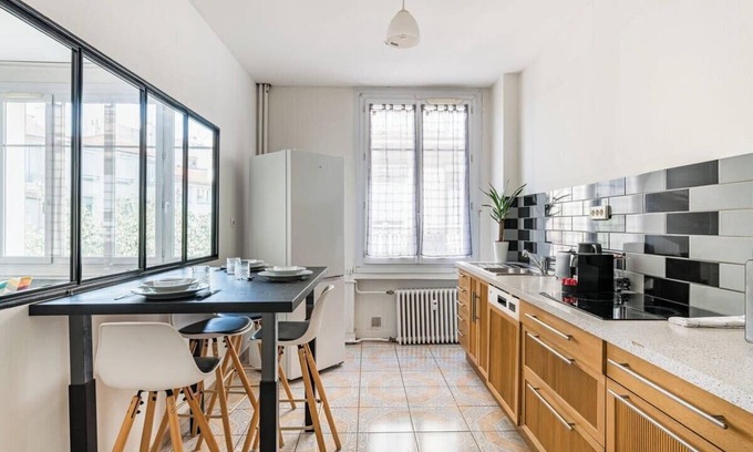 The apartment has been designed to offer a pleasant and comfortable stay experience. The kitchen open to the living room allows you to share convivial moments with your loved ones. The designer furniture and modern equipment guarantee a pleasant stay. ## Neighborhood The neighborhood is quiet and residential, offering a peaceful setting to relax. Nearby you will find many restaurants, bars and shops that will allow you to discover the local life. The main sights of Saint-Étienne are also easily accessible.