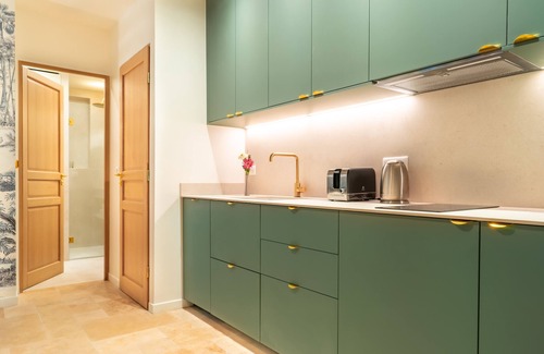 Locastay agency propose you this lovely 2-bedroom apartment located on the ground floor in the courtyard, very quiet and comfortable. It has a living room with a large TV, dining table, fully equipped kitchen, and a sofa bed for 2. Two bedrooms, one with a double bed, and the other one has two single beds. The bathroom has full size shower, two washbasins, a washer & dryer machine.