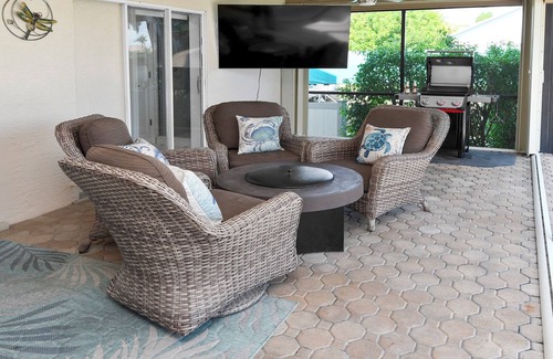 The spacious, covered south-facing terrace features a lounge with four armchairs and a fire pit, a large dining table with six chairs, a BBQ grill station, and an outdoor TV – all enclosed by a screened area. Two sun loungers on the canal deck invite you to relax and soak up the Florida sun.