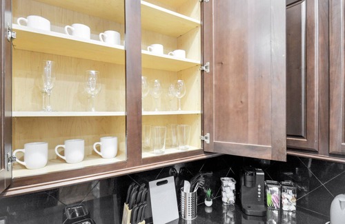Move upstairs to the second floor where you will find an open concept dining and living area and the adjacent fully equipped kitchen, where you'll get to showcase your MasterChef skills. The dining area has a 7-foot dining table with seating for 6, and the layout provides seating for all 12 of your guests! An abundance of natural light accents the living room to create a bright and airy-feeling throughout the home. The living room features a purple reign inspired wall sure to be suitable for the perfect photo!