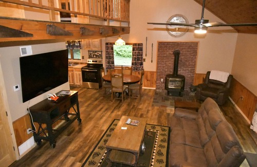 Need a getaway? Family - friends - hiking - hunting, or maybe just you and the dog! This cabin offers three furnished bedrooms and two full bathrooms. The kitchen is fully equipped with cook and serve ware, along with plenty of seasonings and condiments, too! The living room furniture all reclines, and the sofa has a pull down 'table' in the middle. We also provide accommodations for your dogs, including bowls & bags! We have satellite internet and a separate desk area so you can work if necessary. All 3 TV's include streaming ability. The cabin sits on a full acre, so you can take a stroll around the property without interfering with neighbors. To enjoy the firepit, there is plenty of seating - including a picnic table. If it's an indoor night, the gas log fireplace needs no work to create ambiance.