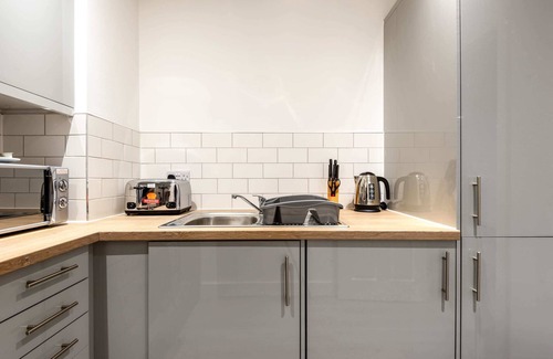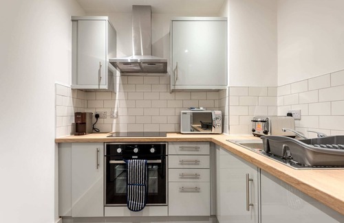 This lovely apartment is a comfortable home away from home and has more than enough space for up to 3 guests (with use of sofa bed). The large open plan living area features a large sofa, armchair and a smart Tv as well as a dining table to enjoy meals. The modern, fully equipped kitchen has everything you need to cook your own meals at home. There is high speed broadband throughout the apartment, perfect for streaming TV (e.g Netflix), and all your browsing, social media and emailing needs. The comfortable bedroom features a king sized bed made up with crisp hotel linen, as well as a desk/dressing table and plentiful storage space for clothes. There is also a sofa bed in the living area for 1 additional guest if required for an additional fee (please select 3 guests when booking). The modern and clean bathroom features a powerful shower and includes complimentary toiletries and fluffy towels for your use.
