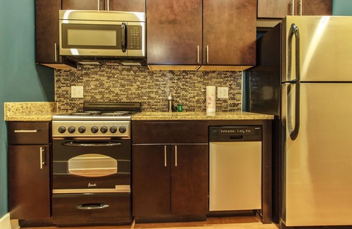 The unit features a cozy living room with a comfortable sofa, a flat-screen TV, and plenty of natural light. The bedroom boasts a plush full-size bed, a dresser, and a closet for ample storage. The bathroom is clean and modern with a shower/tub combo. The fully-equipped kitchen includes a refrigerator, stove, microwave, marble countertops, and coffee maker, along with all necessary cookware and utensils. Not to mention in-unit laundry!