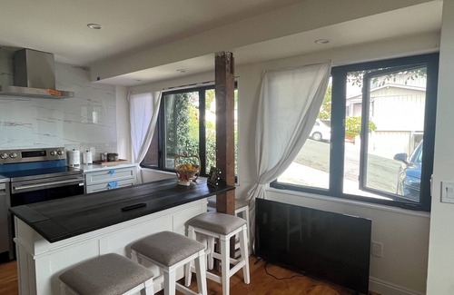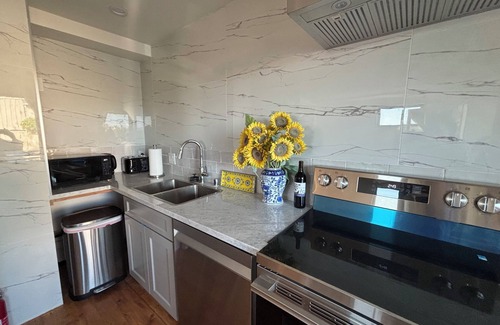 This beautiful Suite is new and very private nestled in a quiet north Laguna residential neighborhood. Just 800 feet from the premier locals’ beach at Crescent Bay. The residence combines the lovely feel of a beach cottage with a modern understated décor. The Living room and kitchen rooms are lined with French casement windows which welcome in natural light and sea breezes. This newly designed space has designer décor, coffered ceilings, wood moldings, wide plank wood floors and wood finishes. The full sized and well equipped kitchen features white marble counters and new appliances. The spacious bedroom is very welcoming and comfortable and includes luxury lines and down comforter. The bathroom is designed with a clean modern feel with white marble accent with white marble tile and glass walk in shower. The living room also provides an additional pull out queen sofa. Full size washer and dryer are included for guest convenience. There is an outside hot and cold water shower as well. The suite is a separate living space attached to a larger residence with its own private entrance.