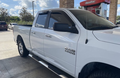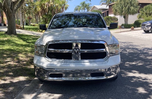 There is a 2018 Dodge Ram1500 parked beside driveway that is available to rent on TURO.