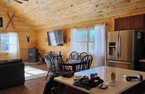 The walkout basement leads right to front yard sledding fun for big and little kids with a few sleds available for your use. Covered parking for your snow machines and ATV vehicles is located under the deck. Heating is provided by a nice pellet stove located in the main family room, and radiant heated floors throughout the cabin. WIFI is included. via Starlink.