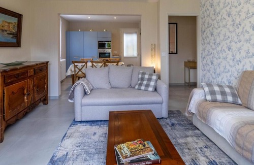 Apartment on the ground floor of the owner's house. Access via a few steps. Ground floor: entrance, living room-kitchen (1 sofa bed 140x190 cm), 2 bedrooms (1 double bed 140x190 cm / 2 single beds 90x190 cm), bathroom (walk-in shower), separate toilet. Private parking inside the house. Outdoor dining area in front of the accommodation. A cozy apartment for 6 people blending old-world charm with modern comforts. A large, bright living room with a fully equipped open-plan kitchen. Three spacious bedrooms. Shared, tree-lined garden.