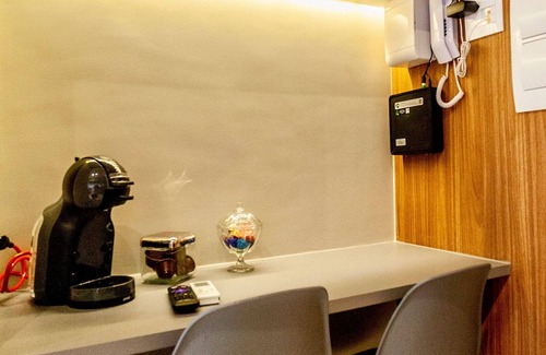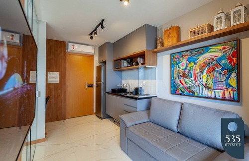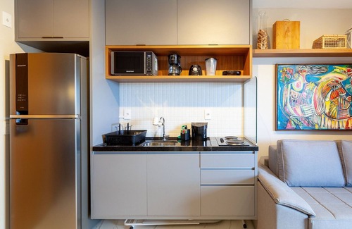 The space is very well-equipped with a 43" Smart LED TV, Split air conditioning in the bedroom and living room, 300Mbps Wi-Fi Internet, Refrigerator, Blender, Microwave, Electric drip coffee maker, Dulce Gusto capsule coffee maker, Sandwich grill, Water filter, Hairdryer, and Iron with an ironing board.