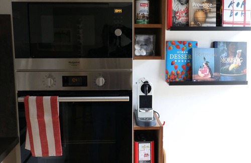 3-plate induction hob. There is a Nespresso machine and a filter coffee maker.