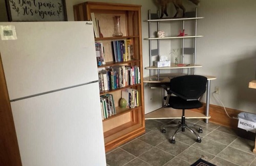 Unwind in Lyndon at this enchanting apartment. This cozy space features 1 bedroom with a comfortable queen bed and spacious closet, a bathroom with a shower, and convenient amenities like private entrance, undercover parking, WiFi, and radiant tiled flooring. There is a kitchenette with full size refrig/freezer, microwave, coffee maker\hot water kettle, toaster but there is no stove or sink. There is a spacious living room area complete with sofa, chairs, flat screen Roku TV, and games. There is a work area with computer desk and chair. Whether you're looking for a tranquil retreat or a home base for exploring the area, this phenomenal apartment is the perfect choice for guests seeking a peaceful getaway. Convenient to biking and skiing at East Burke and Burke Mountain, about 10 miles or a 15 minute drive away, VAST Trails are accessible nearby as well. Adjacent to Lyndon Campus of Vermont State University. Convenient to Stowe Vermont, Littleton, NH and the White Mountains. Great views of the mountains and surrounding area. We look forward to welcoming you to our place.