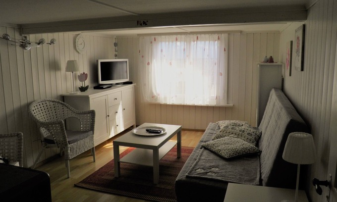 Since this is an attic apartment on the 3rd floor, it is important to know that it has no elevator and the ceilings in the living room are approx. 185 cm high due to the construction in the living room and bedroom. People over 185 cm tall have to pull their heads slightly. Kitchen, bathroom, hallway are normal high.
