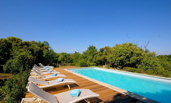 The 11x5 meters pool, which is heated, is secured by immersion alarm and a stone wall, 17 sun loungers, 3 hammocks
