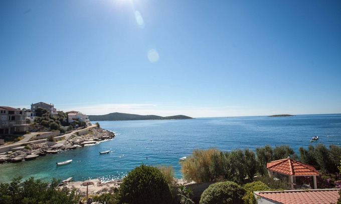 This spacious holiday house is located only 20 m from the nearest beach. The apartment offers three bedrooms, a bathroom, a guest toilet, and a living and dining area with kitchen. Amenities include a washing machine, Wi-Fi, satellite TV, and air conditioning. In front of the living room, you'll find a 25 m² furnished terrace with a grill, as well as a garden that guests are welcome to use. Parking for one car is available at the house. Rocky beach areas are just below the house.
