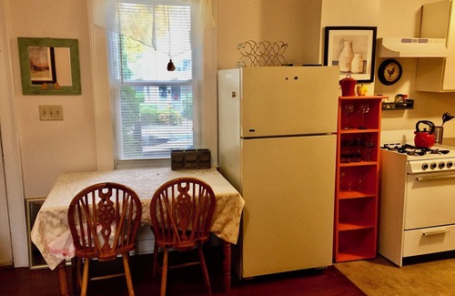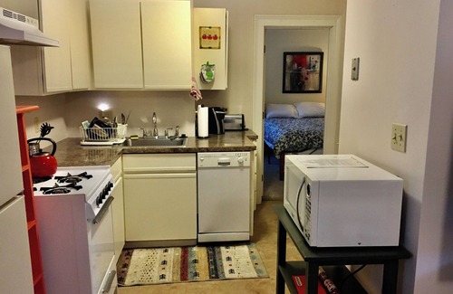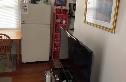 This is a very clean, bright well furnished one bedroom apartment on first floor within a larger Victorian home. Queen bed, fully accessorized. Apartment is totally private and separate. It is ideal for one person, doable for two. Two person maximum occupancy.Parking on site for ONE vehicle only.