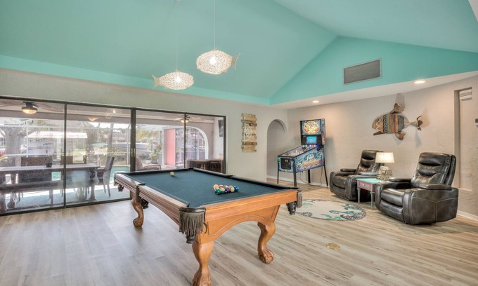 You will enter the house into a huge game room. The game room features a deluxe game console with over 3000 games, a pinball machine, pool table, 2 lounge chairs and a bar table with chairs. It opens directly to the outdoor lanai and pool area and provides gorgeous pool and canal views.