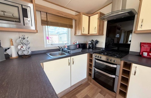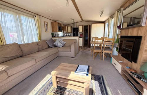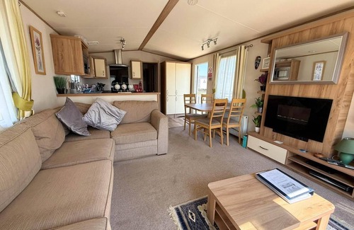 Homely caravan boasting large wrap-around decking and outside furniture to sit and enjoy the sunshine. Sited on a fantastic family-friendly holiday park, just a short walk from the beautiful beach!