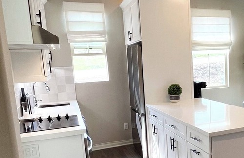 This newly furnished Casita is in a quiet community of Harmony Grove Village. There are no neighbors directly next to the Casita or across. The open living space boasts plenty of windows, full-size Bosch dishwasher and refrigerator, electric cook top and combo microwave and oven, fully stocked kitchen, coffee bar and ample cabinet space. Both bathrooms have quartz countertops and tub/shower combo. There is an abundance of storage in the 2 walk-in closets and hall closet. Watch tv in your king size bed or put your feet up in front of the 72” tv. Bedrooms and bath are stocked with ample linens. The smart tvs have Amazon Prime and are ready for your own streaming subscriptions. Enjoy an evening sunset on the Casita patio, complete with a BBQ, dining area, sofa and fire pit. There is a private entrance to a full size shared laundry room. The ultra quiet heating/air system has 1 thermostat control in the main living space and an additional one in the bedroom. Laminate wood plank flooring throughout. The Casita is equipped with everything you need for a wonderful day at the beach or the pool.
