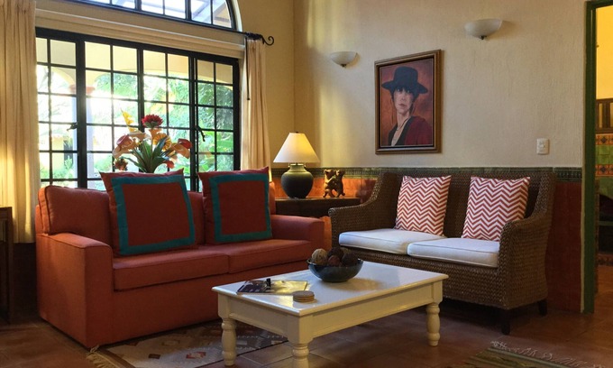Spacious one-bedroom, one-bath casita in a traditionally decorated hacienda. The large bedroom has a comfortable king-sized bed, sitting couch and ample closet space, while the open living room is furnished with sofas, coffee table, armchairs, original artwork, TV and bookcase. The kitchen is fully equipped with a dining area that seats four; the bathroom, two sinks and a colorful oversized tiled tub with shower. The furnished patio is accessed from both the living room and bedroom. Your casita adjoins a beautiful garden of orchids, ferns, cacti, avocado, lime trees and fountain. A staircase adjacent to the kitchen leads to a rooftop sitting area with stunning views of Lake Chapala and the mountains perfect for enjoying a margarita, warm breezes and sunsets.