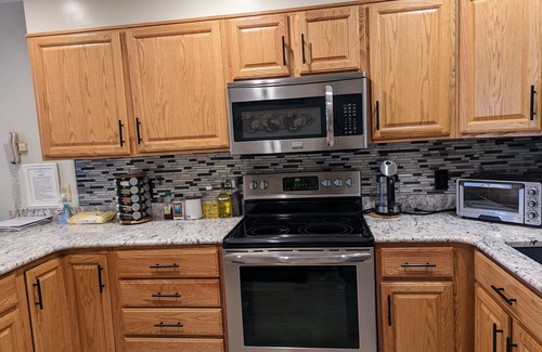 Cook up your favorite meals in our updated and modern kitchen with new stainless steel appliances and granite countertops. Fully equipped with all the appliances and cookwares you need . Dining area seat 6 with 3 additional bar stool seating at the large granite kitchen peninsula.