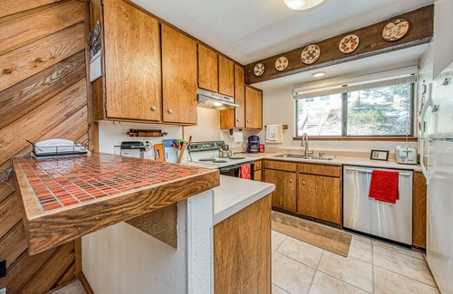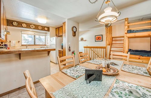 Back inside, get acquainted with your woodsy, comfortable condo, starting with the kitchen, which offers all the appliances and gadgets you need to cook up some breakfast. Once the crew is up and ready to eat, move over to the adjacent dining area for four or down a few steps to the eating nook in the living room. Load up the dishwasher and it’s time to head out and explore.