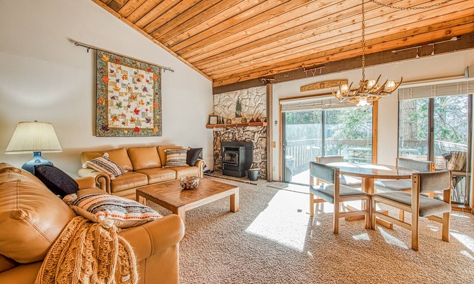 The bright and sunny deck is the perfect place to start your day in this cozy two-bedroom condo, just north of Huntington Lake. Ponderosa pines tower nearby while you contemplate the day – in the summer, will it be mountain biking at the China Peak Mountain Bike Park, only 2.5 miles away? Hiking a nearby trail? Swimming in the lake? You’re only 0.5 mile to to China Peak Landing marina. Your condo also gives you access to a shared pool, hot tub, sauna, and basketball court. In the winter, you’ve got China Peak Ski Resort on your doorstep, only two miles away.