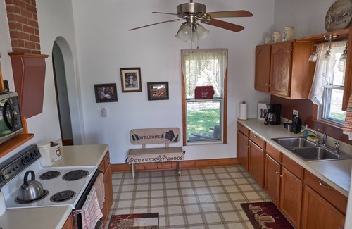 This scenic ridge top farm house originally constructed in 1870 has been in the same family since the early 1940s and was recently restored/remodeled back to the original 10 foot ceilings and brillant wood floors. A large spacious kitchen, tastefully decorated with a country flair. The bathroom includes a walkin tub and messaging jets. There is a cozy front porch to watch the sunrize, a large back yard patio, hammick, gas grill, a burn ring and picnic table. All perfect for entertaining and watching the sunset. Wineries and hiking trails (Little Grande Cannon and Shawnee National Forest) are only a few miles away and traveled to on scenic country roads.