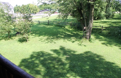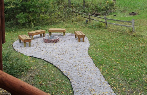 Outside there are two spacious covered decks on the front and back of the cabin. The backyard deck has a large farm style table with lots of extra seating. Also in the backyard is a large fire pit and picnic table ideal for s’mores and scary ghost stories. The huge backyard boasts plenty of space for games and lots privacy that your friends and family will enjoy. Feel free to pick apples & plums in September/October from our trees.